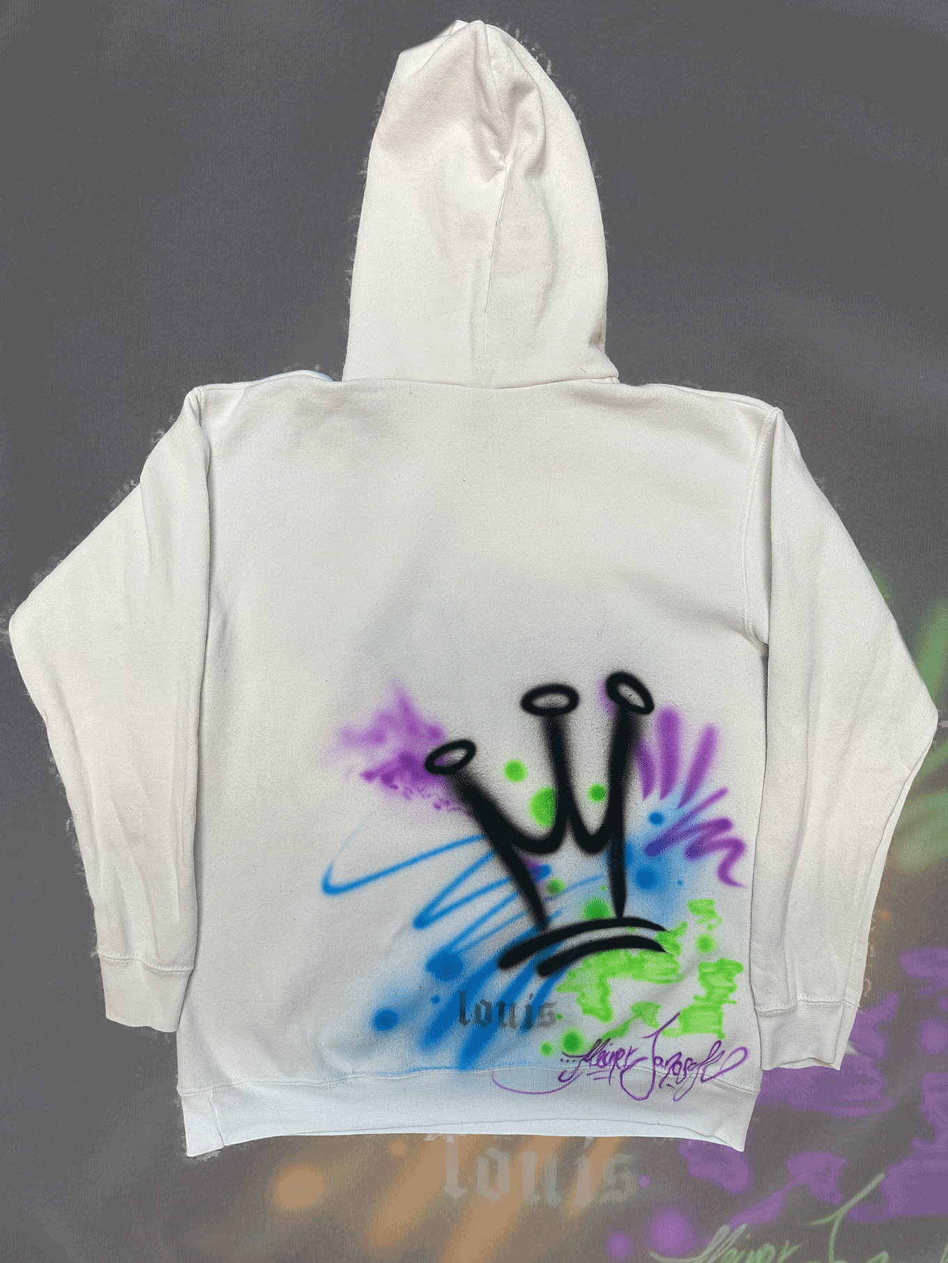 Dieser Hoodie wurde per Hand mit Airbrush-Technik und Textilsprühfarbe gestaltet – inklusive Graffiti-Name, bunten Highlights und kleinen Details wie „kleiner Janosch“.